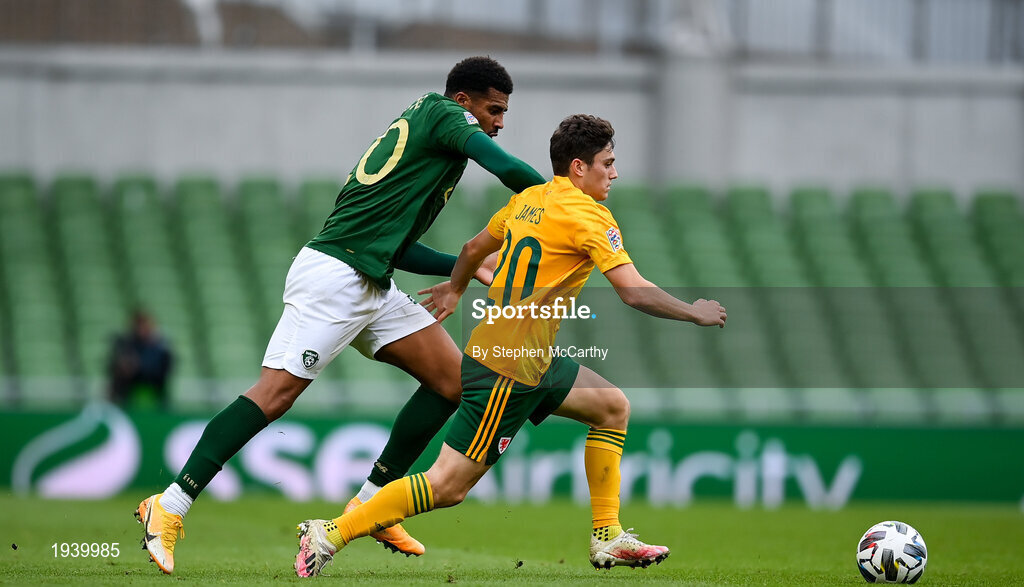 11 October 2020; Daniel James of Wales in action against Cyrus Christie of Republic of Ireland during the UEFA Nations League B match between Republic of Ireland and Wales at the Aviva Stadium in Dublin. Photo by Stephen McCarthy/Sportsfile