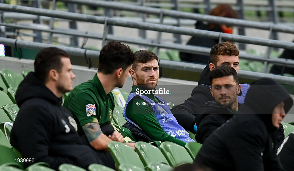 11 October 2020; Jack Byrne, centre, of Republic of Ireland watches on during the UEFA Nations League B match between Republic of Ireland and Wales at the Aviva Stadium in Dublin. Photo by Stephen McCarthy/Sportsfile