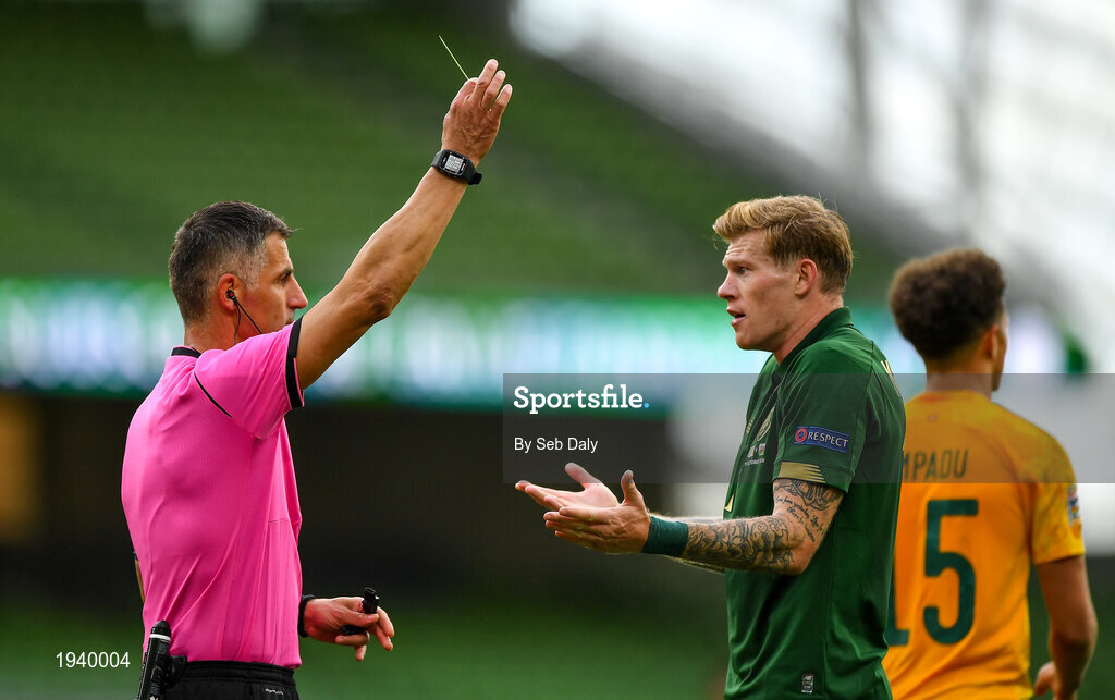 11 October 2020; James McClean of Republic of Ireland is shown a yellow card by referee Tasos Sidiropoulos during the UEFA Nations League B match between Republic of Ireland and Wales at the Aviva Stadium in Dublin. Photo by Seb Daly/Sportsfile