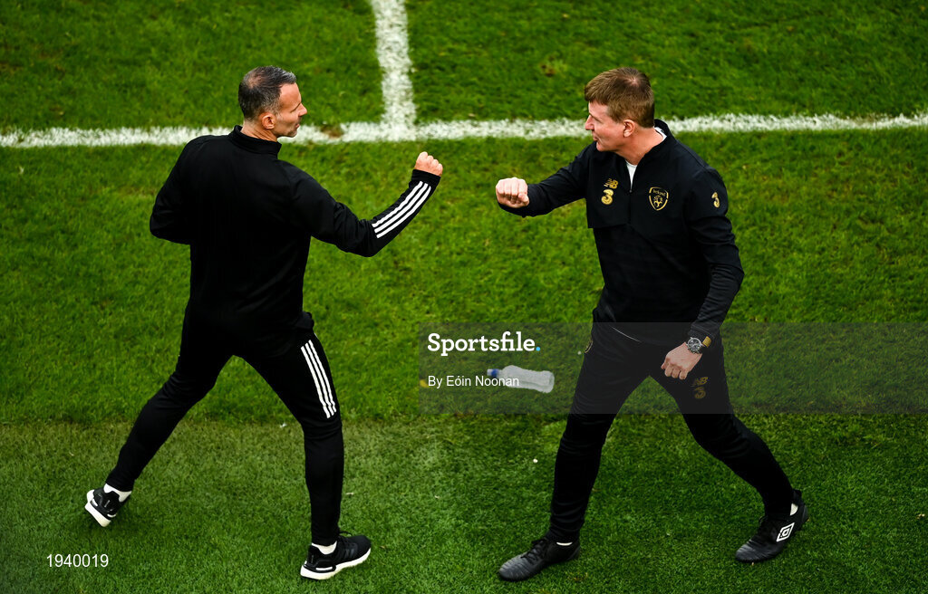 11 October 2020; Wales manager Ryan Giggs, left, and Republic of Ireland manager Stephen Kenny following the UEFA Nations League B match between Republic of Ireland and Wales at the Aviva Stadium in Dublin. Photo by Eóin Noonan/Sportsfile