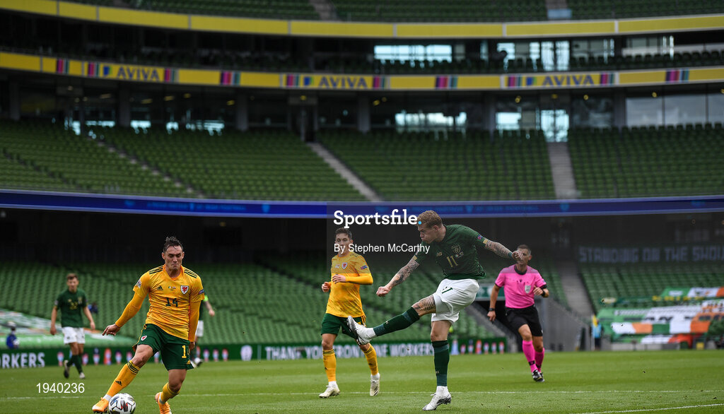 11 October 2020; James McClean of Republic of Ireland has a shot on goal during the UEFA Nations League B match between Republic of Ireland and Wales at the Aviva Stadium in Dublin. Photo by Stephen McCarthy/Sportsfile
