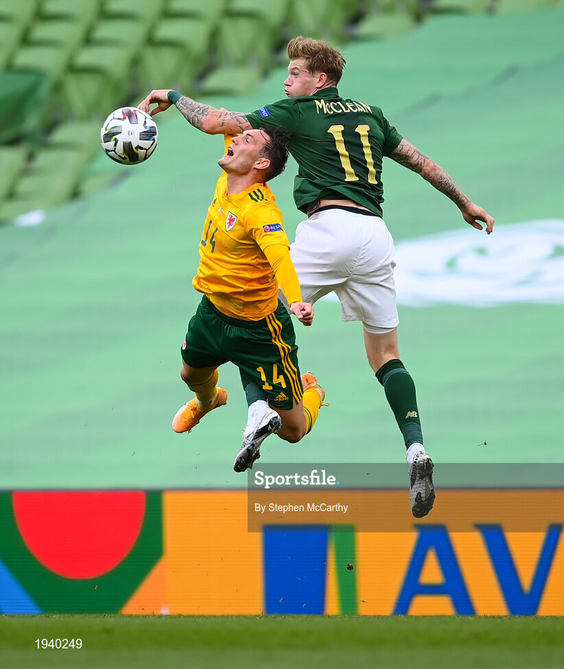 11 October 2020; James McClean of Republic of Ireland in action against Connor Roberts of Wales during the UEFA Nations League B match between Republic of Ireland and Wales at the Aviva Stadium in Dublin. Photo by Stephen McCarthy/Sportsfile