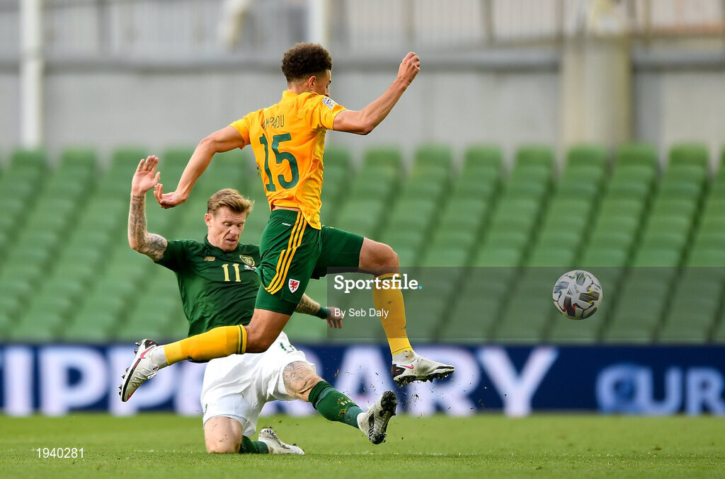 11 October 2020; James McClean of Republic of Ireland fouls Ethan Ampadu of Wales, resulting in a red card, during the UEFA Nations League B match between Republic of Ireland and Wales at the Aviva Stadium in Dublin. Photo by Seb Daly/Sportsfile