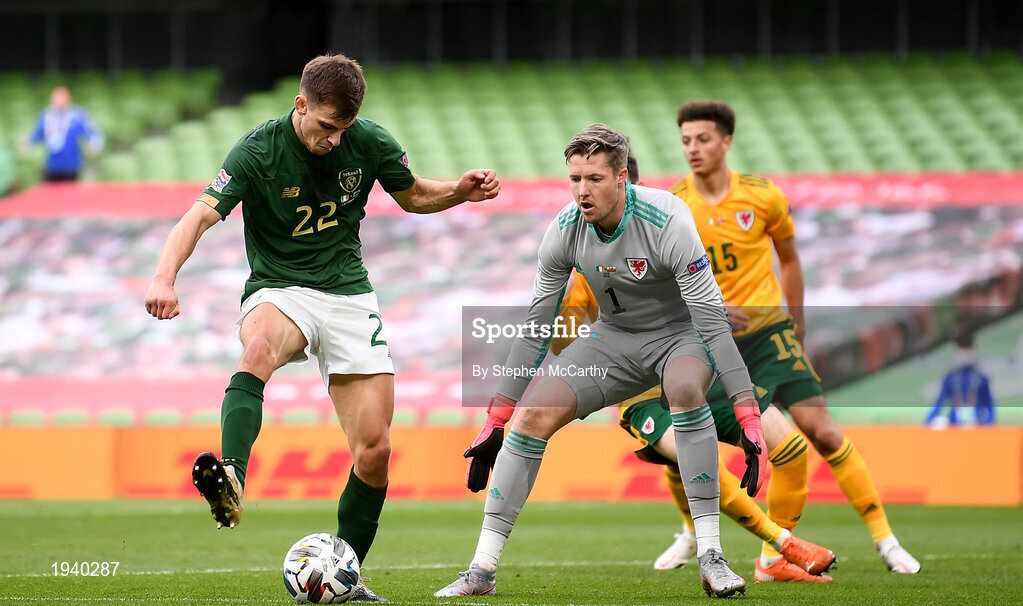 11 October 2020; Jayson Molumby of Republic of Ireland in action against Wayne Hennessey of Wales during the UEFA Nations League B match between Republic of Ireland and Wales at the Aviva Stadium in Dublin. Photo by Stephen McCarthy/Sportsfile