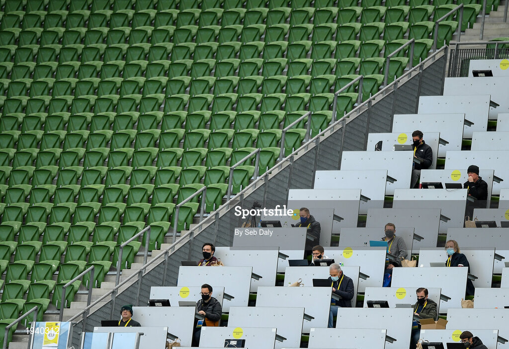 11 October 2020; Members of the press in the media tribune during the UEFA Nations League B match between Republic of Ireland and Wales at the Aviva Stadium in Dublin. Photo by Seb Daly/Sportsfile