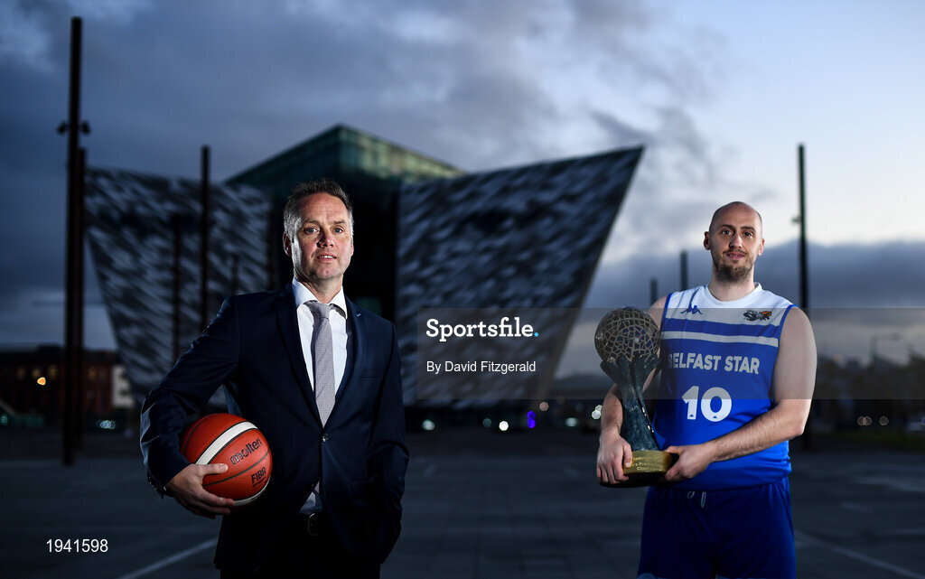 15 October 2020; In attendance at the Super League and Division One 2020/21 season launch are Belfast Star coach Adrian Fulton and player Conor Johnston. DCU Mercy will tip off their season in Trinity Sport against newly promoted Trinity Meteors on Saturday, 17th at 2pm. Belfast Star will have a new home this season in Lisburn Racquets. Their first game at the venue is due to be on November 28th, when they host UCD Marian in round 6. Photo by David Fitzgerald/Sportsfile