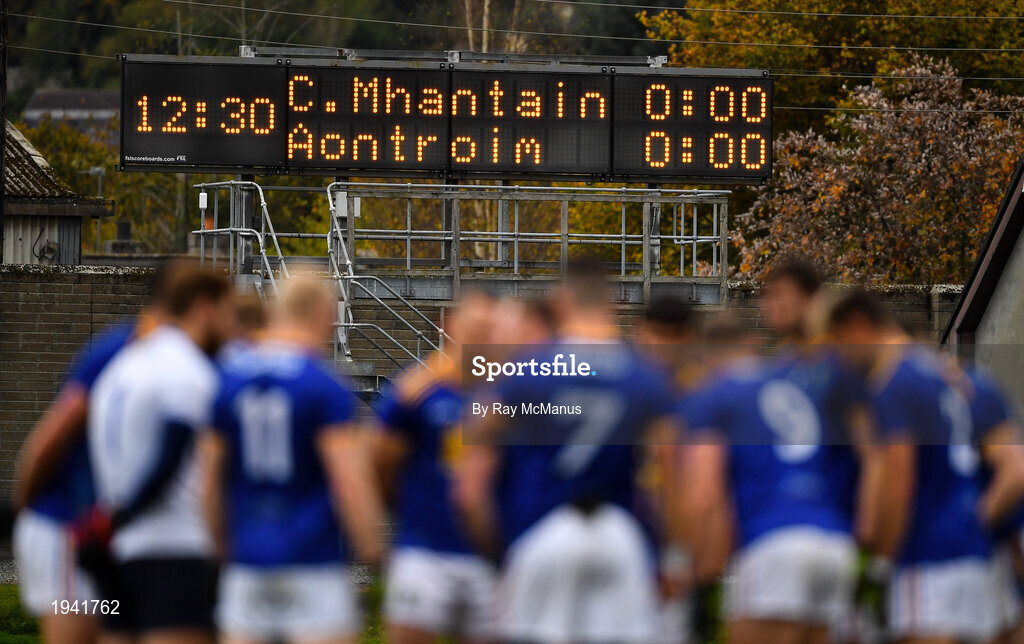 17 October 2020; A general view of the scoreboard as Wicklow players huddle before the Allianz Football League Division 4 Round 6 match between Wicklow and Antrim at the County Grounds in Aughrim, Wicklow. Photo by Ray McManus/Sportsfile