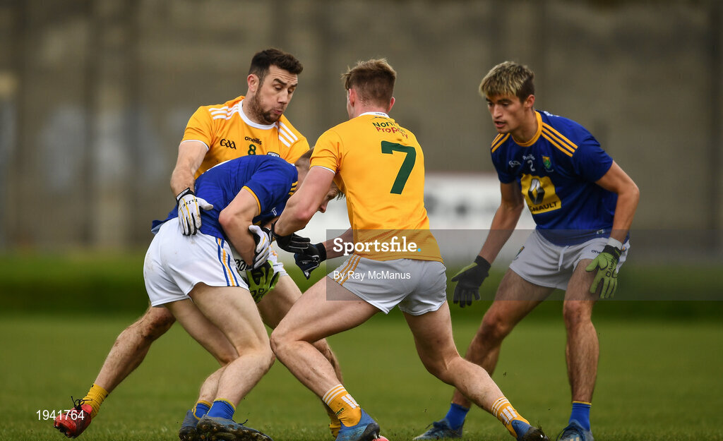 17 October 2020; Andy Maher, supported by Paddy O'Keane, right, of Wicklow in action against Peter Healy, 7, and Conor Murray of Antrim during the Allianz Football League Division 4 Round 6 match between Wicklow and Antrim at the County Grounds in Aughrim, Wicklow. Photo by Ray McManus/Sportsfile