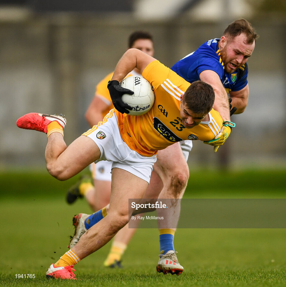 17 October 2020; Patrick McBride of Antrim in action against Eoin Murtagh of Wicklow during the Allianz Football League Division 4 Round 6 match between Wicklow and Antrim at the County Grounds in Aughrim, Wicklow. Photo by Ray McManus/Sportsfile