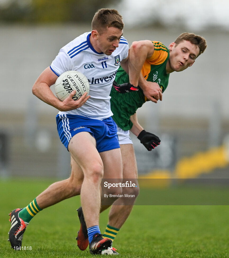 17 October 2020; Michael Bannigan of Monaghan in action against Gavin White of Kerry during the Allianz Football League Division 1 Round 6 match between Monaghan and Kerry at Grattan Park in Inniskeen, Monaghan. Photo by Brendan Moran/Sportsfile
