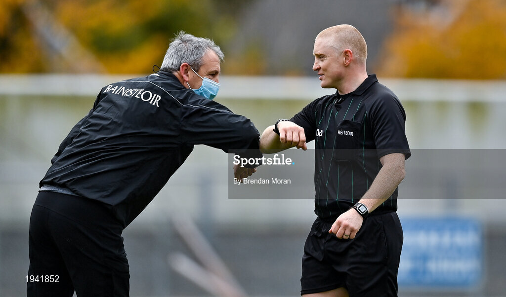 17 October 2020; Kerry manager Peter Keane and referee Barry Cassidy after the Allianz Football League Division 1 Round 6 match between Monaghan and Kerry at Grattan Park in Inniskeen, Monaghan. Photo by Brendan Moran/Sportsfile