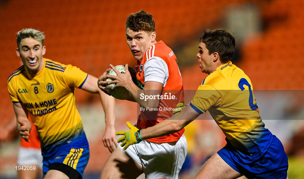 17 October 2020; Oisín O'Neill of Armagh in action against Cathal Compton, left, and David Murray of Roscommon during the Allianz Football League Division 2 Round 6 match between Armagh and Roscommon at the Athletic Grounds in Armagh. Photo by Piaras Ó Mídheach/Sportsfile