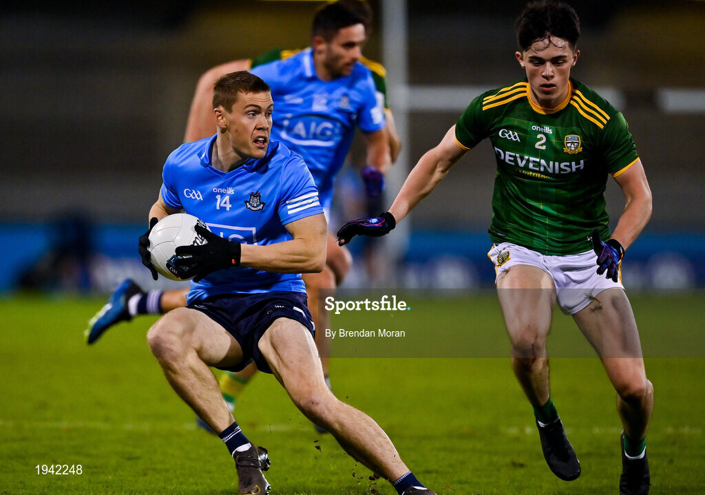 17 October 2020; Con O'Callaghan of Dublin in action against Eoin Harkin of Meath during the Allianz Football League Division 1 Round 6 match between Dublin and Meath at Parnell Park in Dublin. Photo by Brendan Moran/Sportsfile