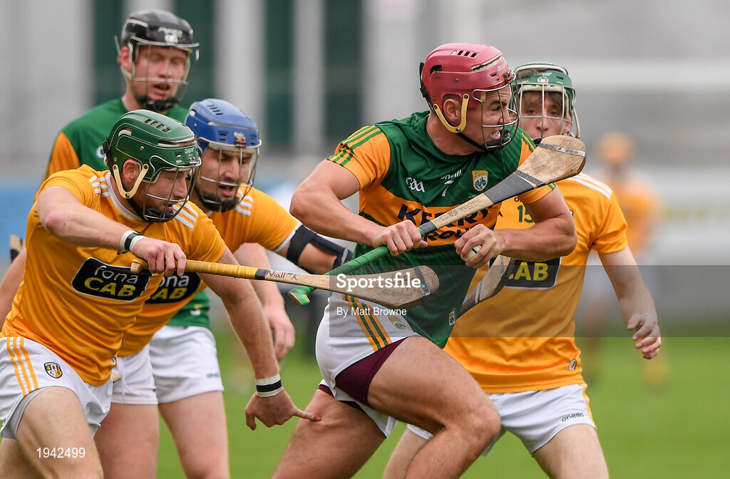 18 October 2020; Fionan Mackessy of Kerry in action against Niall McKenna, Donal Nugent and James McNaughton of Antrim during the Allianz Hurling League Division 2A Final match between Antrim and Kerry at Bord na Mona O'Connor Park in Tullamore, Offaly. Photo by Matt Browne/Sportsfile