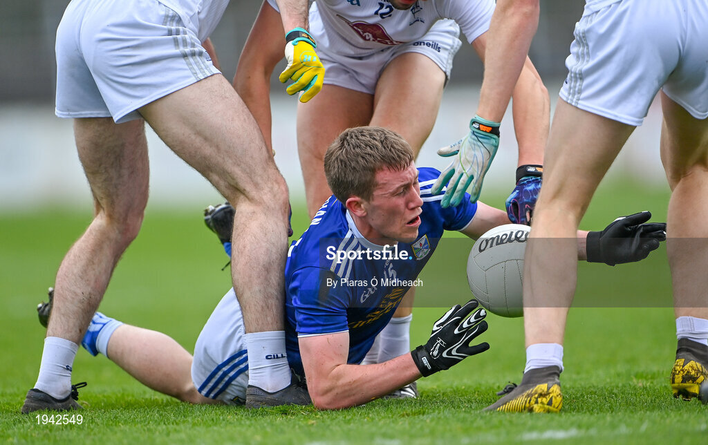 18 October 2020; Evan Doughty of Cavan tries to keep possession under pressure from Kildare defenders during the Allianz Football League Division 2 Round 6 match between Kildare and Cavan at St Conleth's Park in Newbridge, Kildare. Photo by Piaras Ó Mídheach/Sportsfile