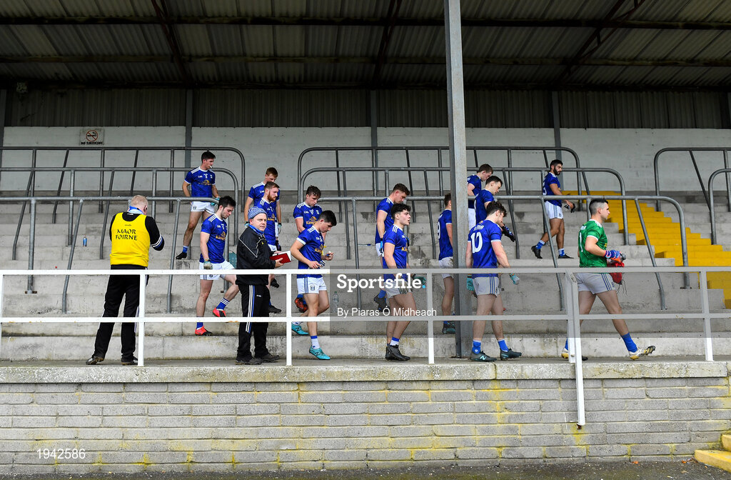 18 October 2020; Cavan manager Mickey Graham looks on as his players make their way from the team talk in the stand to the pitch for the second half of the Allianz Football League Division 2 Round 6 match between Kildare and Cavan at St Conleth's Park in Newbridge, Kildare. Photo by Piaras Ó Mídheach/Sportsfile