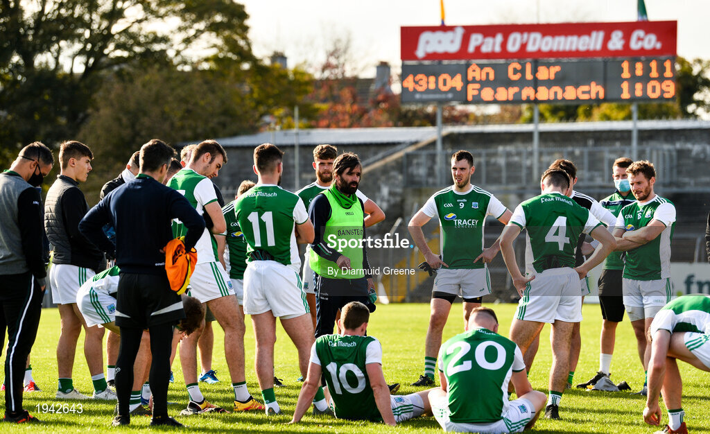 18 October 2020; Fermanagh manager Ryan McMenamin speaks to his players after the Allianz Football League Division 2 Round 6 match between Clare and Fermanagh at Cusack Park in Ennis, Clare. Photo by Diarmuid Greene/Sportsfile