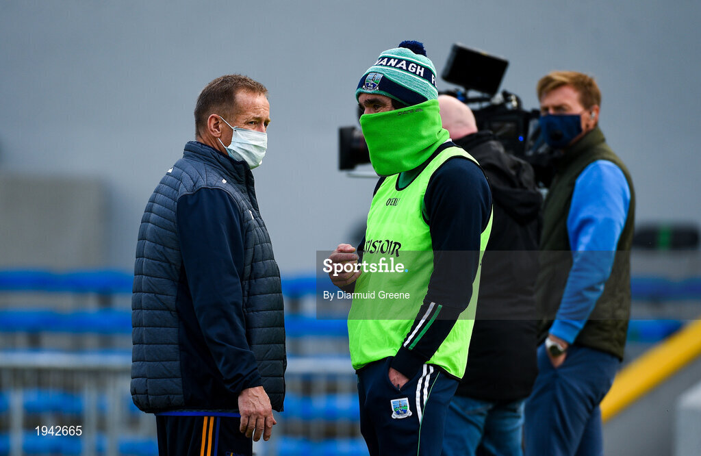 18 October 2020; Clare manager Colm Collins and Fermanagh manager Ryan McMenamin in conversation after the Allianz Football League Division 2 Round 6 match between Clare and Fermanagh at Cusack Park in Ennis, Clare. Photo by Diarmuid Greene/Sportsfile