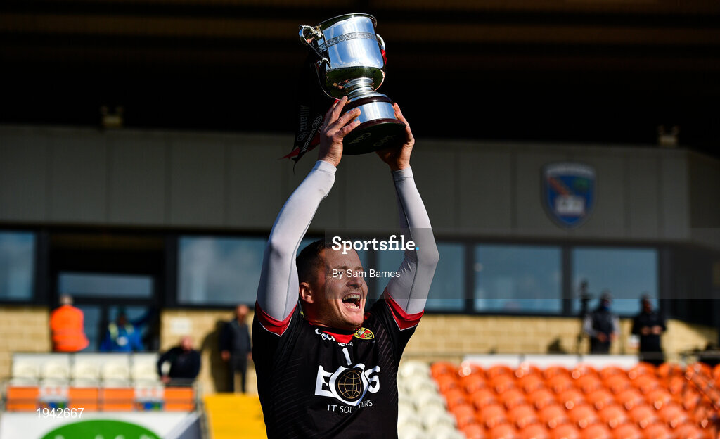 18 October 2020; Stephen Keith of Down lifts the cup following the Allianz Hurling League Division 2B Final match between Down and Derry at the Athletic Grounds in Armagh. Photo by Sam Barnes/Sportsfile