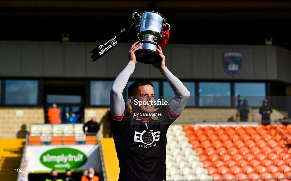 18 October 2020; Stephen Keith of Down lifts the cup following the Allianz Hurling League Division 2B Final match between Down and Derry at the Athletic Grounds in Armagh. Photo by Sam Barnes/Sportsfile