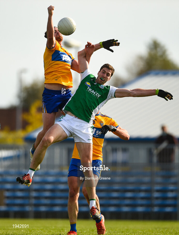 18 October 2020; Cian O'Dea of Clare competes for a high ball with Eoin Donnelly of Fermanagh during the Allianz Football League Division 2 Round 6 match between Clare and Fermanagh at Cusack Park in Ennis, Clare. Photo by Diarmuid Greene/Sportsfile