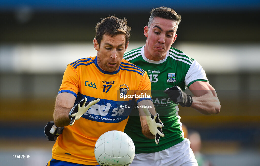 18 October 2020; Gary Brennan of Clare in action against Stephen McGullion of Fermanagh during the Allianz Football League Division 2 Round 6 match between Clare and Fermanagh at Cusack Park in Ennis, Clare. Photo by Diarmuid Greene/Sportsfile