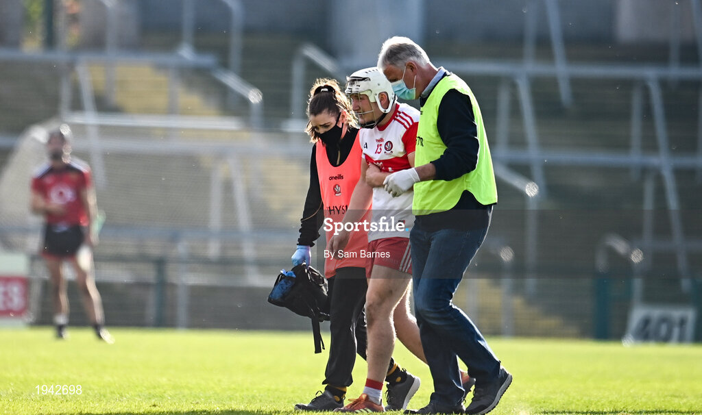 18 October 2020; Richie Mullan of Derry is helped off the field after picking up an injury during the Allianz Hurling League Division 2B Final match between Down and Derry at the Athletic Grounds in Armagh. Photo by Sam Barnes/Sportsfile