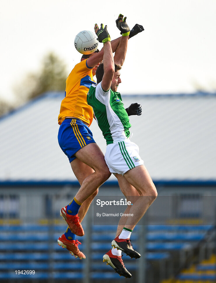 18 October 2020; Eoin Donnelly of Fermanagh competes for a high ball with Cathal O'Connor during the Allianz Football League Division 2 Round 6 match between Clare and Fermanagh at Cusack Park in Ennis, Clare. Photo by Diarmuid Greene/Sportsfile