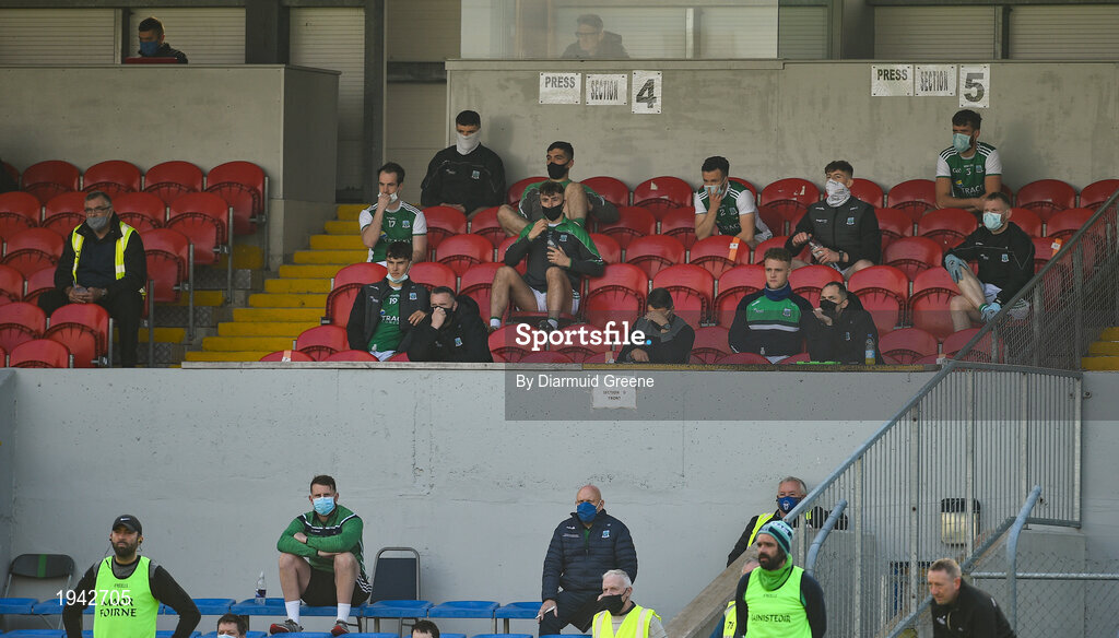 18 October 2020; A view of players, management and backroom staff on the Fermanagh bench during the Allianz Football League Division 2 Round 6 match between Clare and Fermanagh at Cusack Park in Ennis, Clare. Photo by Diarmuid Greene/Sportsfile