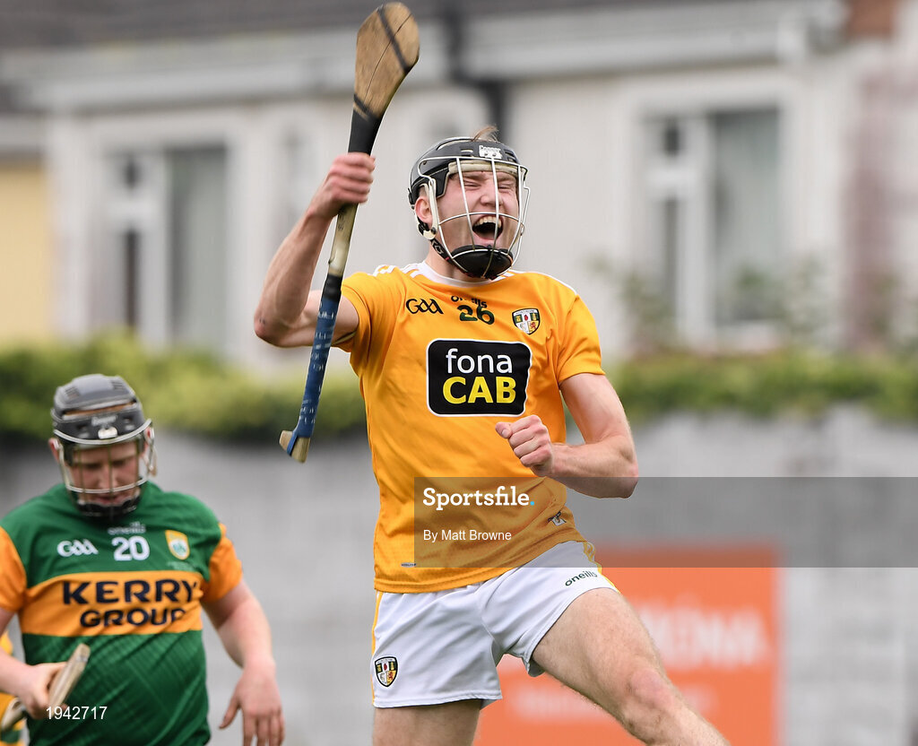 18 October 2020; Aodhan O'Brien of Antrim celebrates after the Allianz Hurling League Division 2A Final match between Antrim and Kerry at Bord na Mona O'Connor Park in Tullamore, Offaly. Photo by Matt Browne/Sportsfile