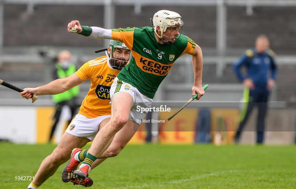 18 October 2020; Shane Nolan of Kerry in action against Ciaran Johnston of Antrim during the Allianz Hurling League Division 2A Final match between Antrim and Kerry at Bord na Mona O'Connor Park in Tullamore, Offaly. Photo by Matt Browne/Sportsfile