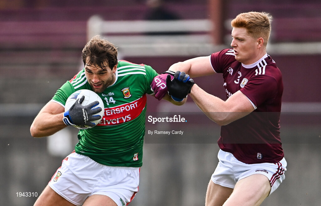 18 October 2020; Aidan O'Shea of Mayo is tackled by Séan Andy Ó Ceallaigh of Galway during the Allianz Football League Division 1 Round 6 match between Galway and Mayo at Tuam Stadium in Tuam, Galway. Photo by Ramsey Cardy/Sportsfile