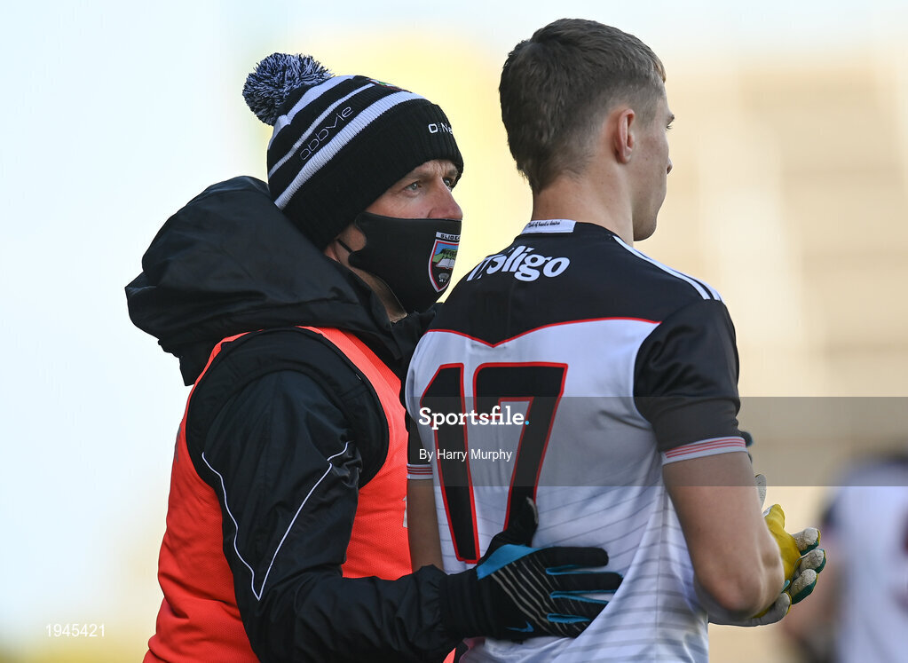 24 October 2020; Sligo manager Paul Taylor speaks with Brian Cox of Sligo during the Allianz Football League Division 4 Round 7 match between Sligo and Limerick at Markievicz Park in Sligo. Photo by Harry Murphy/Sportsfile