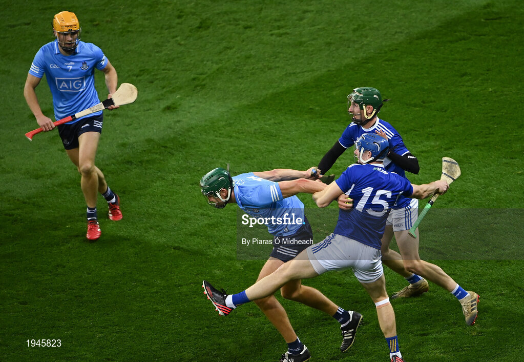 24 October 2020; Chris Crummey of Dublin in action against Stephen Maher, 15, and Aaron Dunphy during the Leinster GAA Hurling Senior Championship Quarter-Final match between Laois and Dublin at Croke Park in Dublin. Photo by Piaras Ó Mídheach/Sportsfile