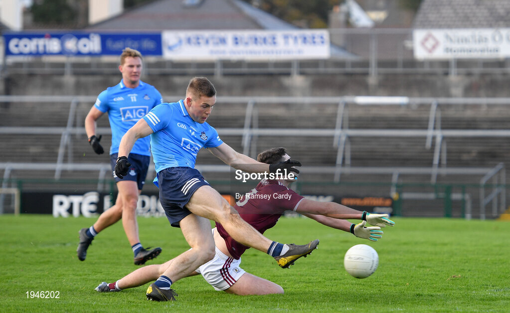 25 October 2020; Con O'Callaghan of Dublin shoots to score his side's second goal despite the attention of Sean Mulkerrin of Galway during the Allianz Football League Division 1 Round 7 match between Galway and Dublin at Pearse Stadium in Galway. Photo by Ramsey Cardy/Sportsfile