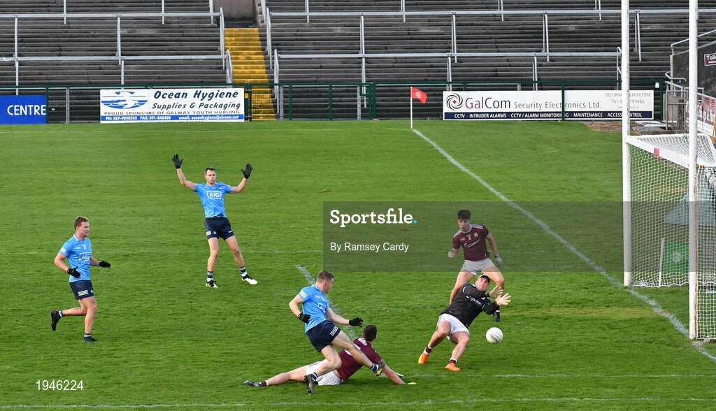 25 October 2020; Con O'Callaghan of Dublin shoots to score his side's second goal past Galway goalkeeper Bernard Power during the Allianz Football League Division 1 Round 7 match between Galway and Dublin at Pearse Stadium in Galway. Photo by Ramsey Cardy/Sportsfile