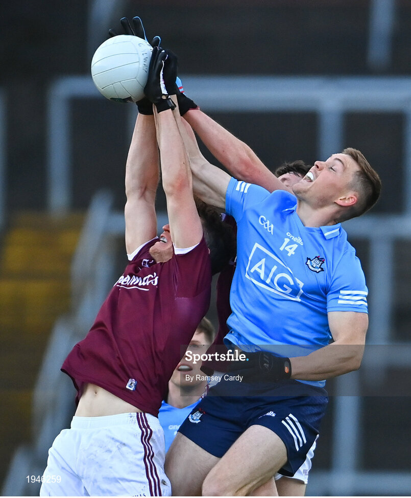 25 October 2020; Con O'Callaghan of Dublin in action against Johnny Heaney, left, and Matthias Barrett of Galway during the Allianz Football League Division 1 Round 7 match between Galway and Dublin at Pearse Stadium in Galway. Photo by Ramsey Cardy/Sportsfile