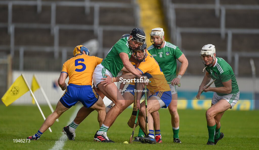 25 October 2020; Gearóid Hegarty of Limerick in action against Stephen O'Halloran of Clare during the Munster GAA Hurling Senior Championship Quarter-Final match between Limerick and Clare at Semple Stadium in Thurles, Tipperary. This game also doubles up as the Allianz Hurling League Division 1 Final as the GAA season was shortened due to the coronavirus pandemic and both teams had qualified for the final. Photo by Daire Brennan/Sportsfile