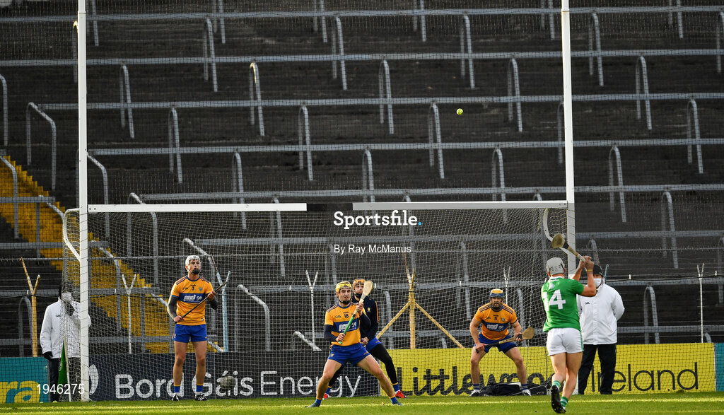 25 October 2020; Aaron Gillane of Limerick scores a point, from a free, during the Munster GAA Hurling Senior Championship Quarter-Final match between Limerick and Clare at Semple Stadium in Thurles, Tipperary. This game also doubles up as the Allianz Hurling League Division 1 Final as the GAA season was shortened due to the coronavirus pandemic and both teams had qualified for the final. Photo by Ray McManus/Sportsfile