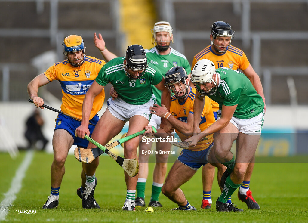 25 October 2020; Gearóid Hegarty, left, and Kyle Hayes of Limerick in action against Seadna Morey, left, and Stephen O'Halloran of Clare during the Munster GAA Hurling Senior Championship Quarter-Final match between Limerick and Clare at Semple Stadium in Thurles, Tipperary. This game also doubles up as the Allianz Hurling League Division 1 Final as the GAA season was shortened due to the coronavirus pandemic and both teams had qualified for the final. Photo by Daire Brennan/Sportsfile