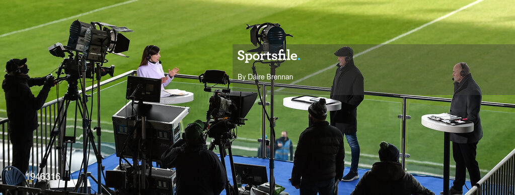 25 October 2020; The Sunday Game host Joanne Cantwell with analysts Donal Óg Cusack, left, and Anthony Daly ahead of the Munster GAA Hurling Senior Championship Quarter-Final match between Limerick and Clare at Semple Stadium in Thurles, Tipperary. This game also doubles up as the Allianz Hurling League Division 1 Final as the GAA season was shortened due to the coronavirus pandemic and both teams had qualified for the final. Photo by Daire Brennan/Sportsfile