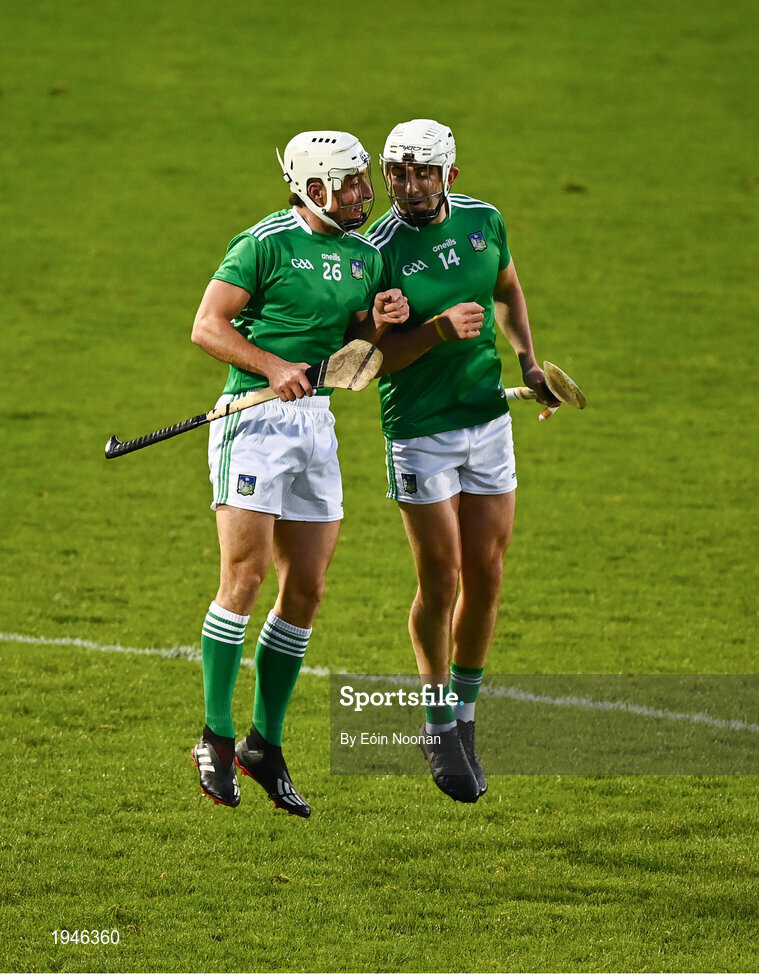 25 October 2020; Aaron Gillane of Limerick, right, with team-mate Pat Ryan of Limerick following the Munster GAA Hurling Senior Championship Quarter-Final match between Limerick and Clare at Semple Stadium in Thurles, Tipperary. This game also doubles up as the Allianz Hurling League Division 1 Final as the GAA season was shortened due to the coronavirus pandemic and both teams had qualified for the final. Photo by Eóin Noonan/Sportsfile