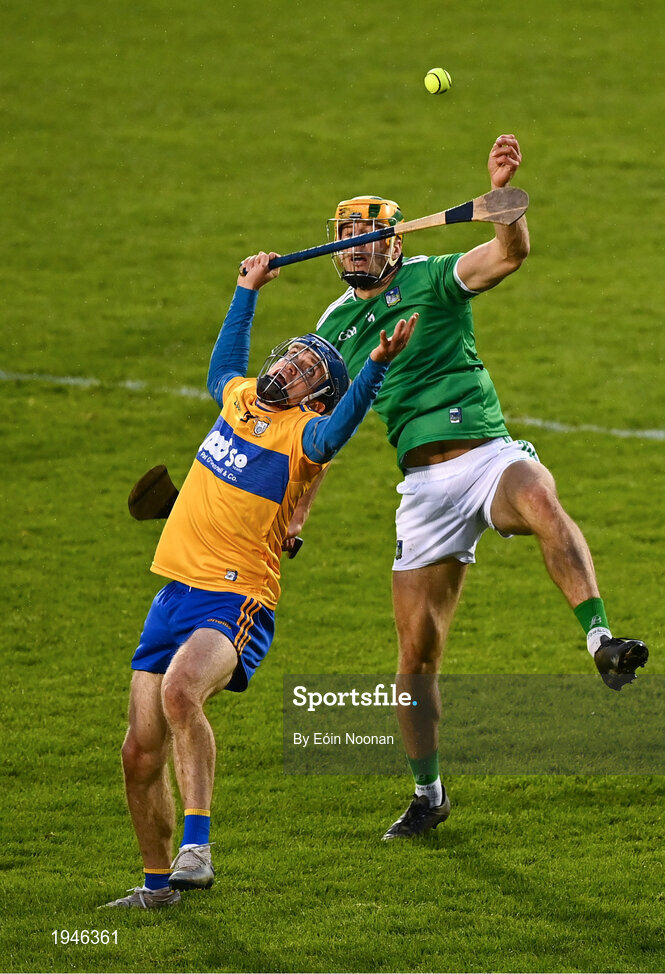 25 October 2020; Shane O'Donnell of Clare in action against Dan Morrissey of Limerick during the Munster GAA Hurling Senior Championship Quarter-Final match between Limerick and Clare at Semple Stadium in Thurles, Tipperary. This game also doubles up as the Allianz Hurling League Division 1 Final as the GAA season was shortened due to the coronavirus pandemic and both teams had qualified for the final. Photo by Eóin Noonan/Sportsfile