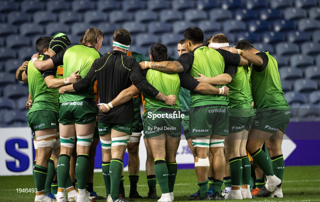 25 October 2020; The Connacht team huddle ahead of the Guinness PRO14 match between Edinburgh and Connacht at BT Murrayfield in Edinburgh, Scotland. Photo by Paul Devlin/Sportsfile
