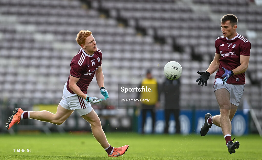 25 October 2020; Adrian Varley, left, and Liam Silke of Galway during the Allianz Football League Division 1 Round 7 match between Galway and Dublin at Pearse Stadium in Galway. Photo by Ramsey Cardy/Sportsfile