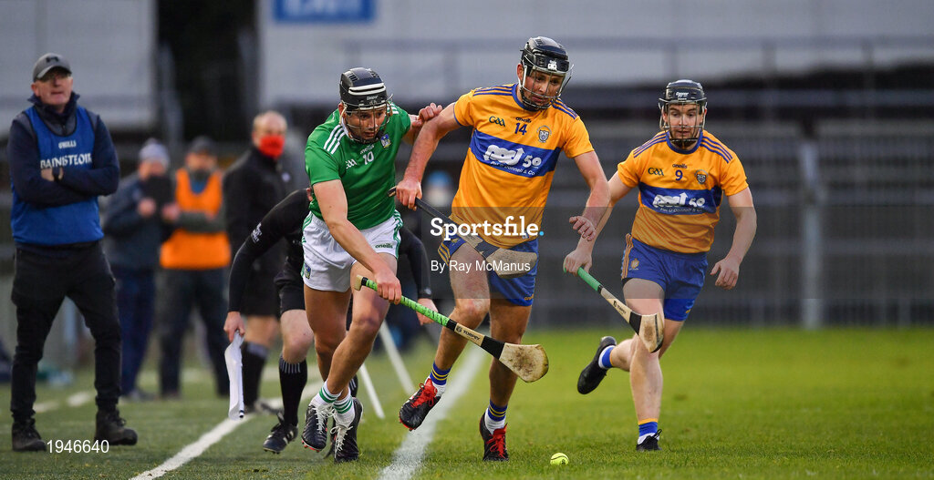 25 October 2020; Gearóid Hegarty of Limerick in action against Cathal Malone, 14 and Tony Kelly of Clare during the Munster GAA Hurling Senior Championship Quarter-Final match between Limerick and Clare at Semple Stadium in Thurles, Tipperary. This game also doubles up as the Allianz Hurling League Division 1 Final as the GAA season was shortened due to the coronavirus pandemic and both teams had qualified for the final. Photo by Ray McManus/Sportsfile
