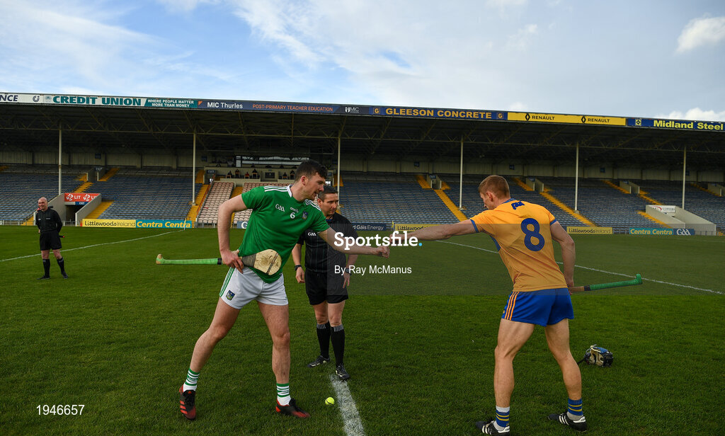 25 October 2020; The Limerick, Declan Hannon, and Clare captains, David McInerney, greet each other accross referee Fergal Horgan before the Munster GAA Hurling Senior Championship Quarter-Final match between Limerick and Clare at Semple Stadium in Thurles, Tipperary. This game also doubles up as the Allianz Hurling League Division 1 Final as the GAA season was shortened due to the coronavirus pandemic and both teams had qualified for the final. Photo by Ray McManus/Sportsfile