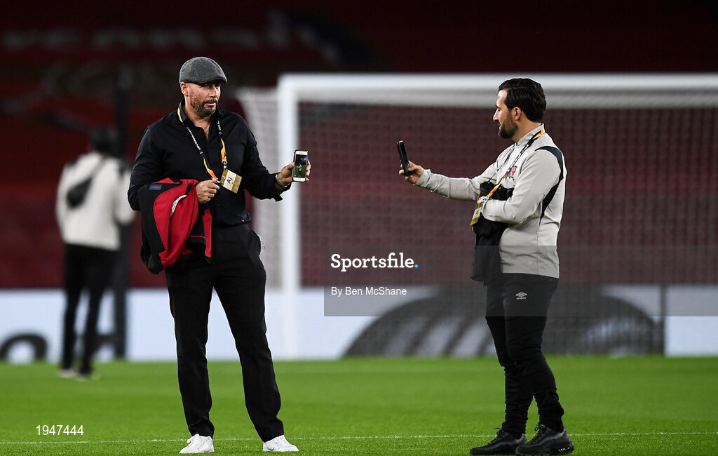 29 October 2020; Dundalk interim head coach Filippo Giovagnoli, left, and assistant coach Giuseppe Rossi on their mobile phones as they walk the pitch prior to the UEFA Europa League Group B match between Arsenal and Dundalk at the Emirates Stadium in London, England. Photo by Ben McShane/Sportsfile