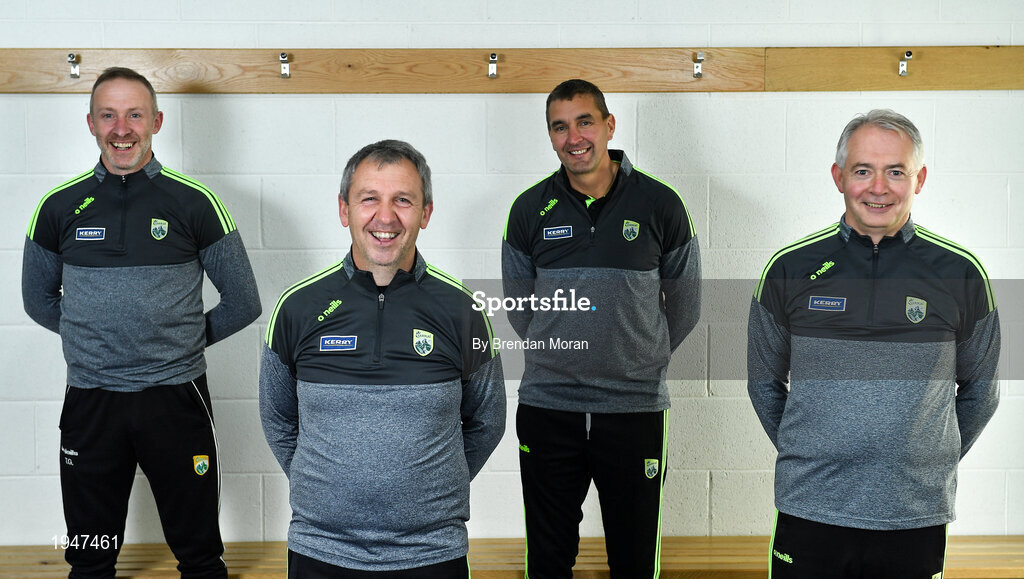 27 October 2020; Kerry manager Peter Keane, 2nd from left, with selectors, from left, Tommy Griffin, Maurice Fitzgerald and James Foley during a Kerry Football squad portraits session at the Kerry GAA Centre of Excellence in Currans, Kerry. Photo by Brendan Moran/Sportsfile