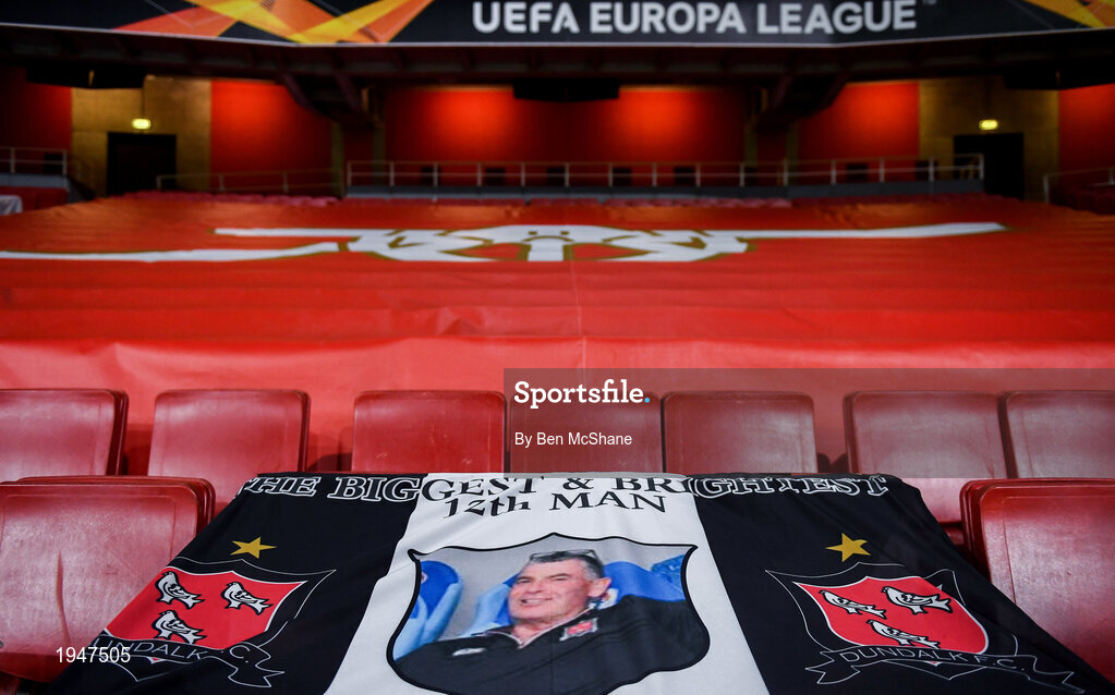 29 October 2020; A banner in commemoration to the late Dundalk team videographer Harry Taaffe in the stadium prior to the UEFA Europa League Group B match between Arsenal and Dundalk at the Emirates Stadium in London, England. Photo by Ben McShane/Sportsfile